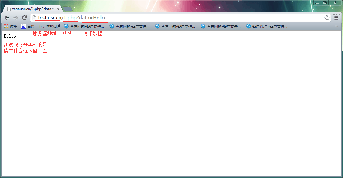 1:通過瀏覽器以GET的方法向服務器提交數據Hello。