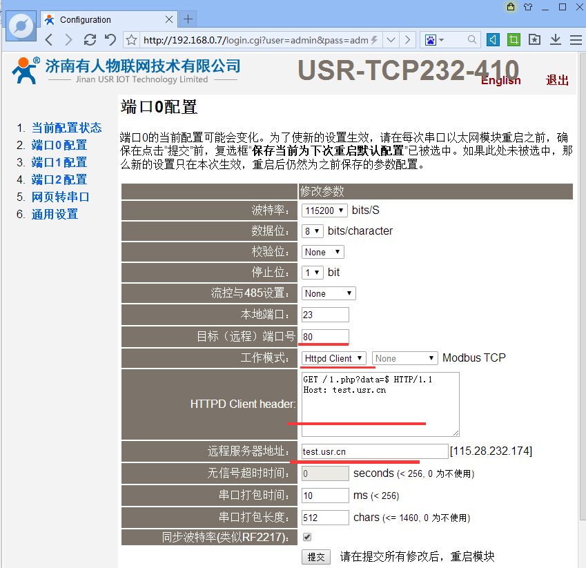 2:在串口0設置工作方式為Httpd Client .目標端口為http端口80,遠程服務器為服務器IP:test.usr.cn