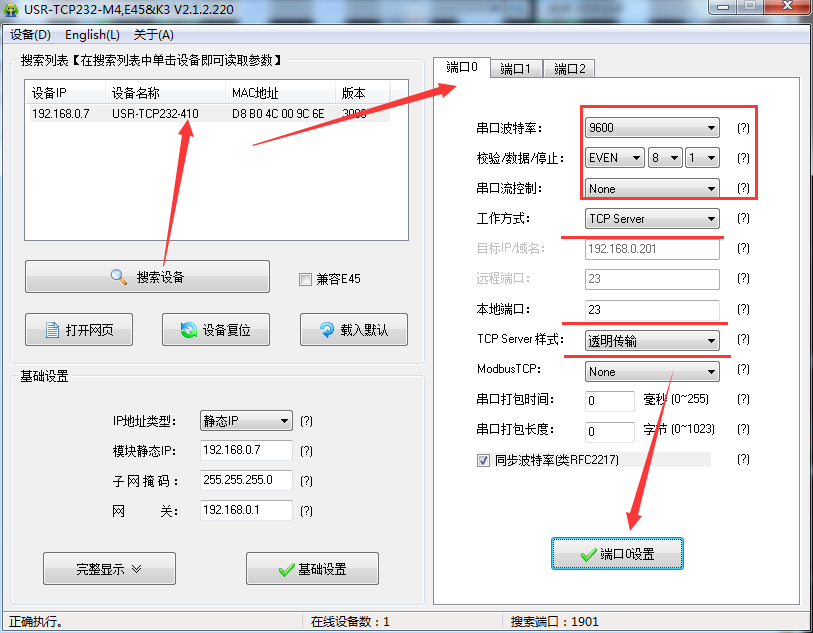 1:將串口服務器網口直連電腦網口或者連接路由器網口。使用設置軟件設置參數:搜索設備,設置串口服務器的IP地址與局域網網段一致,設置串口服務器的波特率為9600,校驗數據位停止位:EVEN 8 1。這個參數要和PLC的參數一致。打包時間和長度都設置為0.然后端口0設置。(注:搜索到的版本要在3006及3006以上才支持)