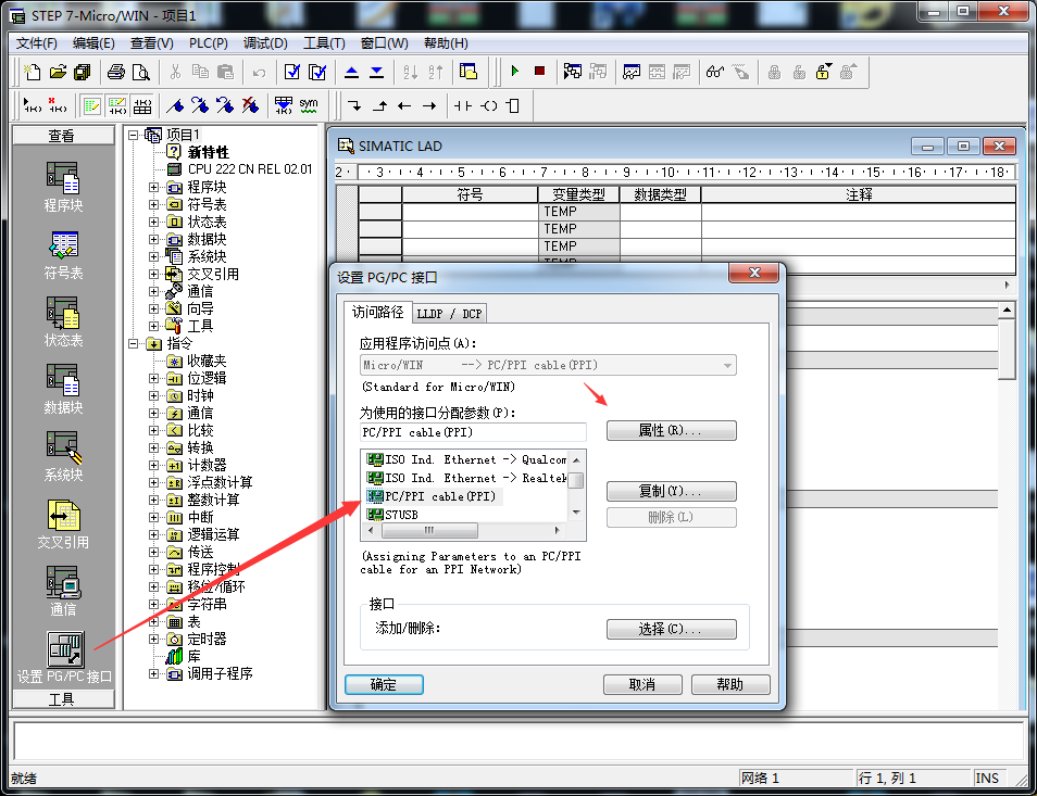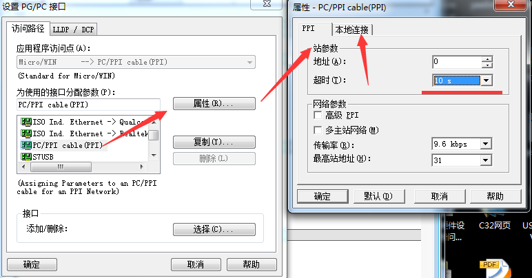 點擊設置PG/PC接口,選擇PC/PPI,點擊屬性,將超時時間設置大點,設置10S或者100S.然后點擊本地連接選擇剛才虛擬的串口com1.