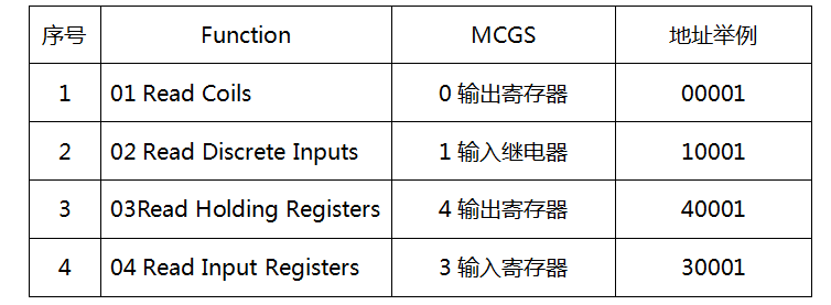 (3)Function為寄存器功能碼,經常用到的4種分別對應關系如下