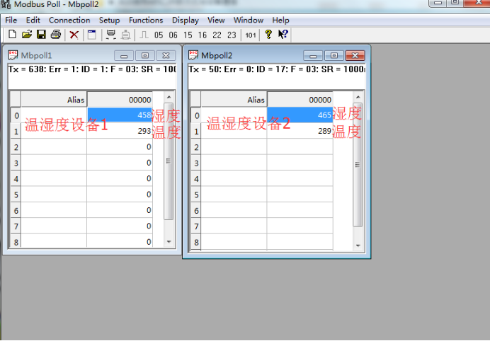 設置完成點擊OK,將顯示定義的寄存器列表以及讀取到溫濕度設備2的溫濕度數據。