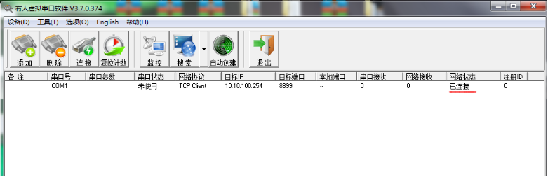 i)已添加COM口連接到模塊后,虛擬串口軟件上的網(wǎng)絡(luò)狀態(tài)會顯示已連接。如網(wǎng)絡(luò)狀態(tài)顯示連接失敗,請將604模塊恢復(fù)默認(rèn)設(shè)置并重復(fù)上述步驟。