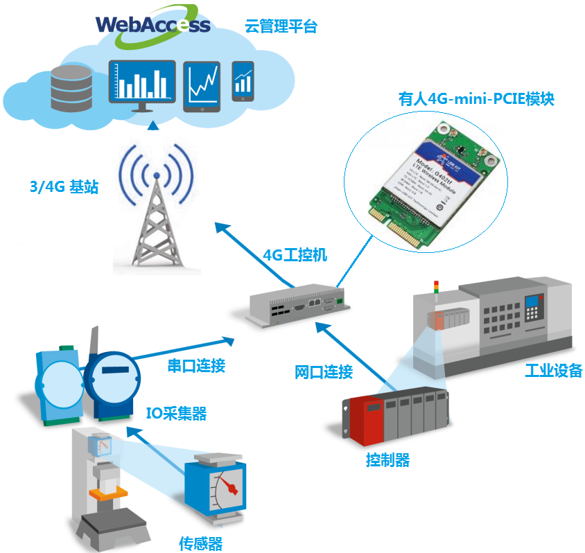 1:實現功能:研華工控機,內部自帶mini-PCIE接口,內部可以插接mini-PCIE接口的WiFi和4G模塊,實現工控機的聯網。連接上4G模塊后,工控機不用連接寬帶網絡即可實現工控機上網,可以把現場的數據發送到遠端工控云管理平臺上。
