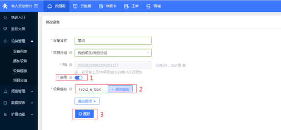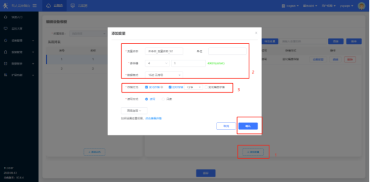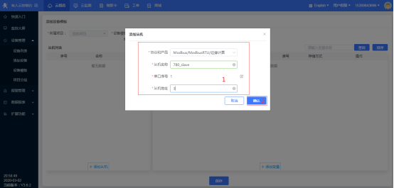 2、登錄有人云組態平臺,在設備管理界面添加設備,設備IMEI和SN編號唯一,可以在設備背面標簽查看。點擊下一步,選擇相應的模板,點擊保存;完善從機信息和從機數據點(要采集的PLC或終端設備的寄存器地址)。