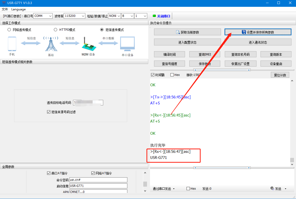 (2)打開串口——進入配置狀態——設置工作模式為短信透傳,設置目標手機號——設置并保存所有參數——串口打印開機信息說明設備重啟成功