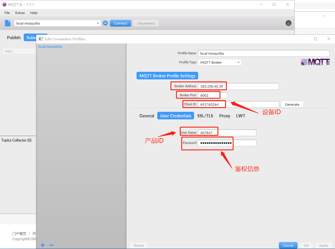 4) 設(shè)置MQTT.fx連接onenet平臺(tái)