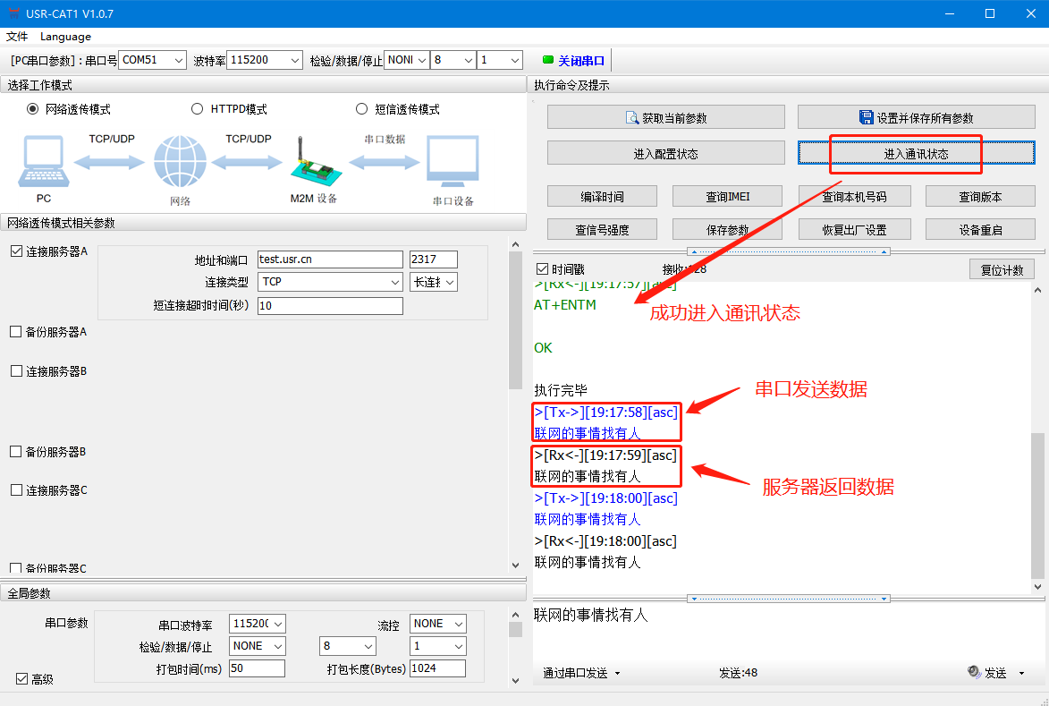 通過串口發送<聯網的事情找有人>,可以看到服務器返回了相同的內容,說明DTU工作是沒有問題的