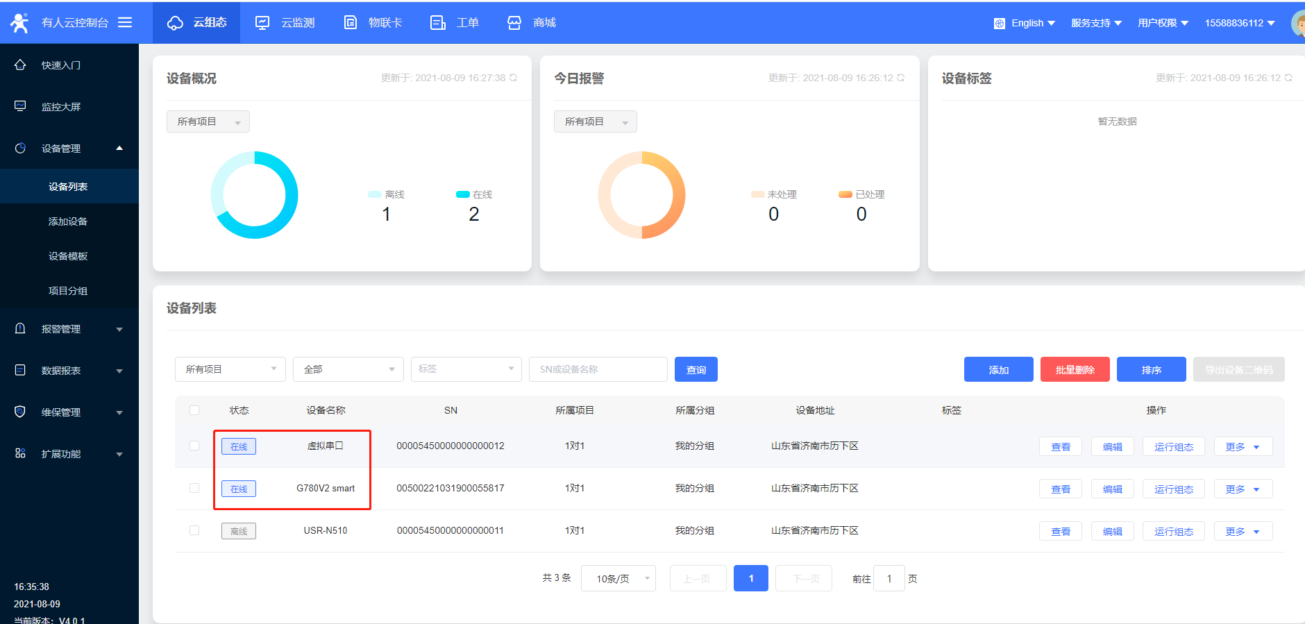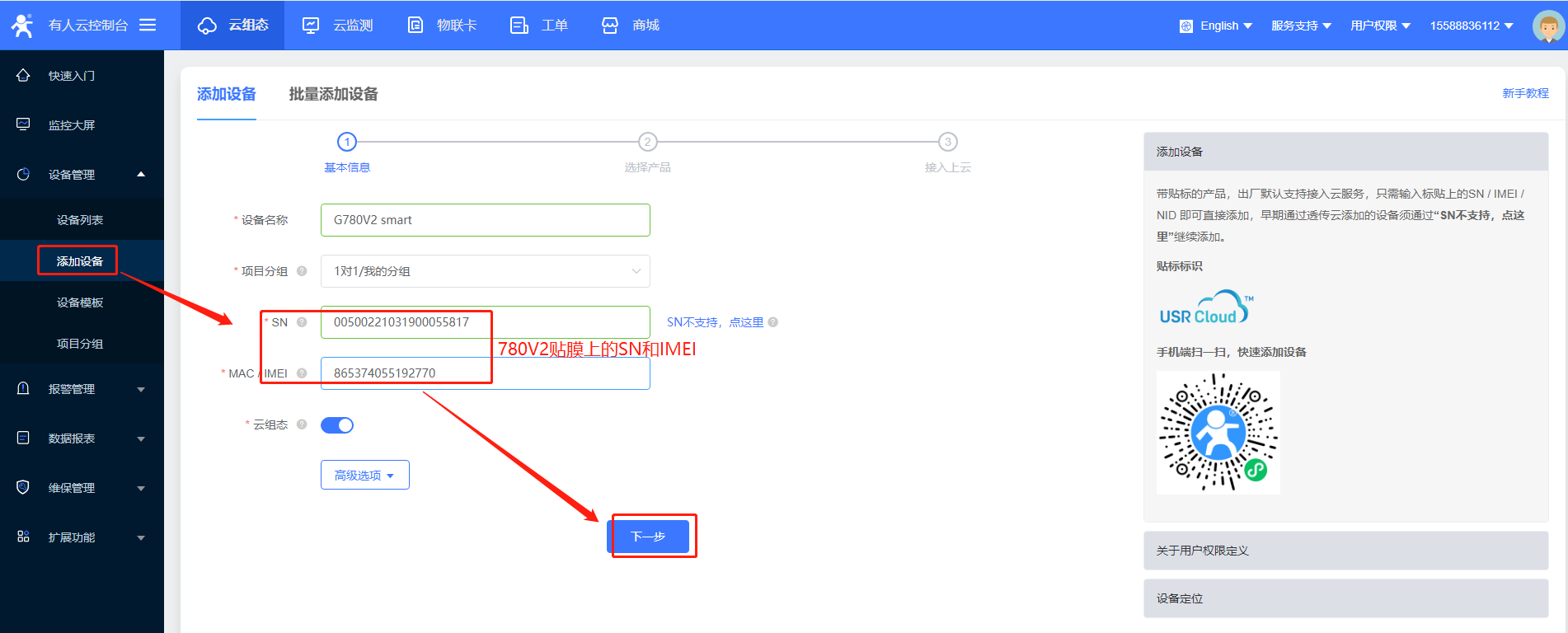 780V2端不用特殊設置,在云端添加設備后,重啟下G780V2,等待設備上線即可