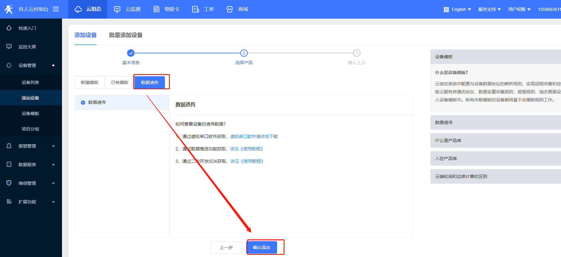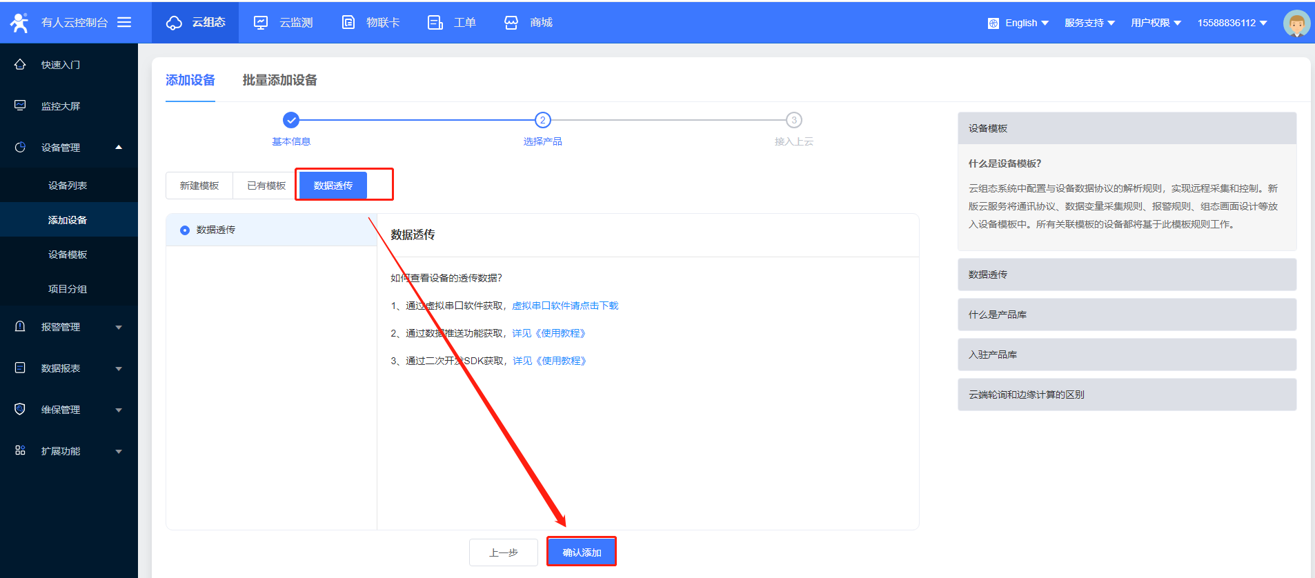 4>再添加一個設備,用于虛擬串口軟件,選擇數據透傳,添加成功后可以在設備列表中看到