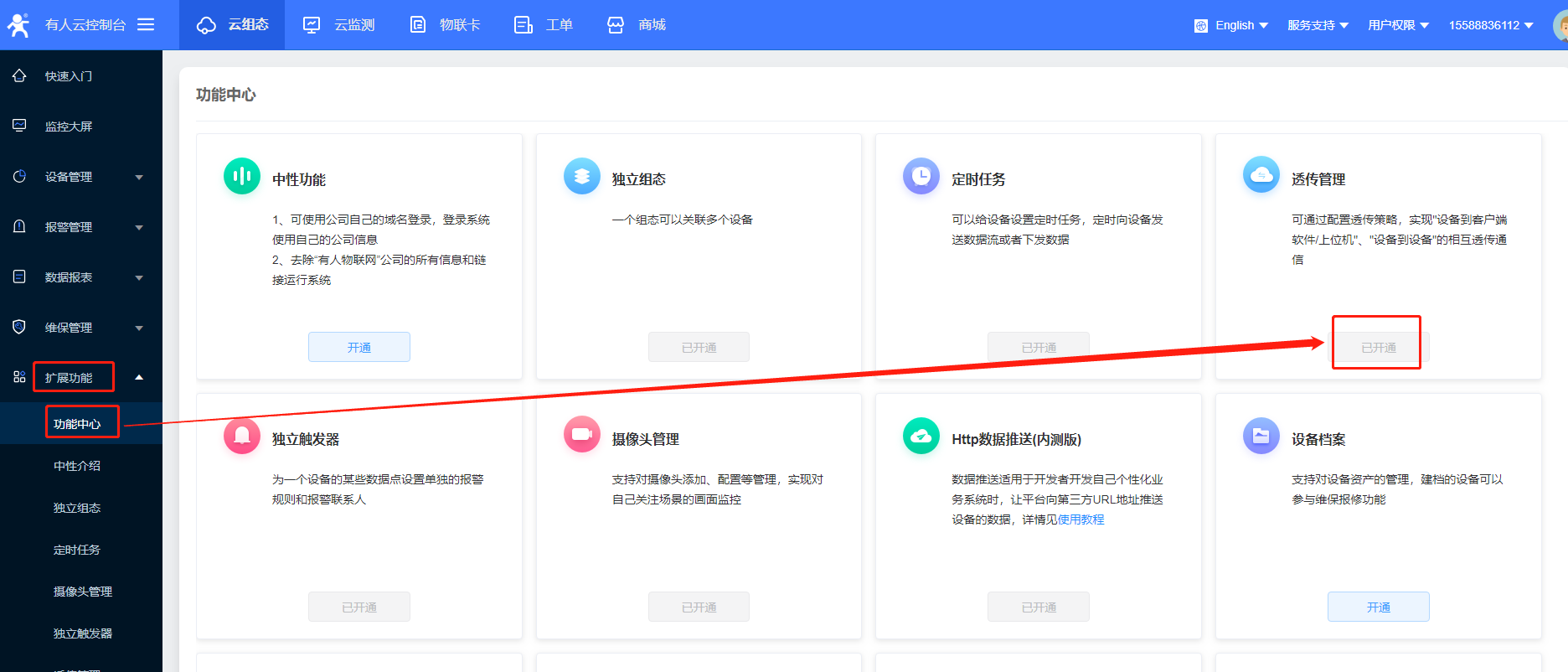 5>擴展功能--功能中心---開通透傳管理(如果已開通,請忽略此步驟)