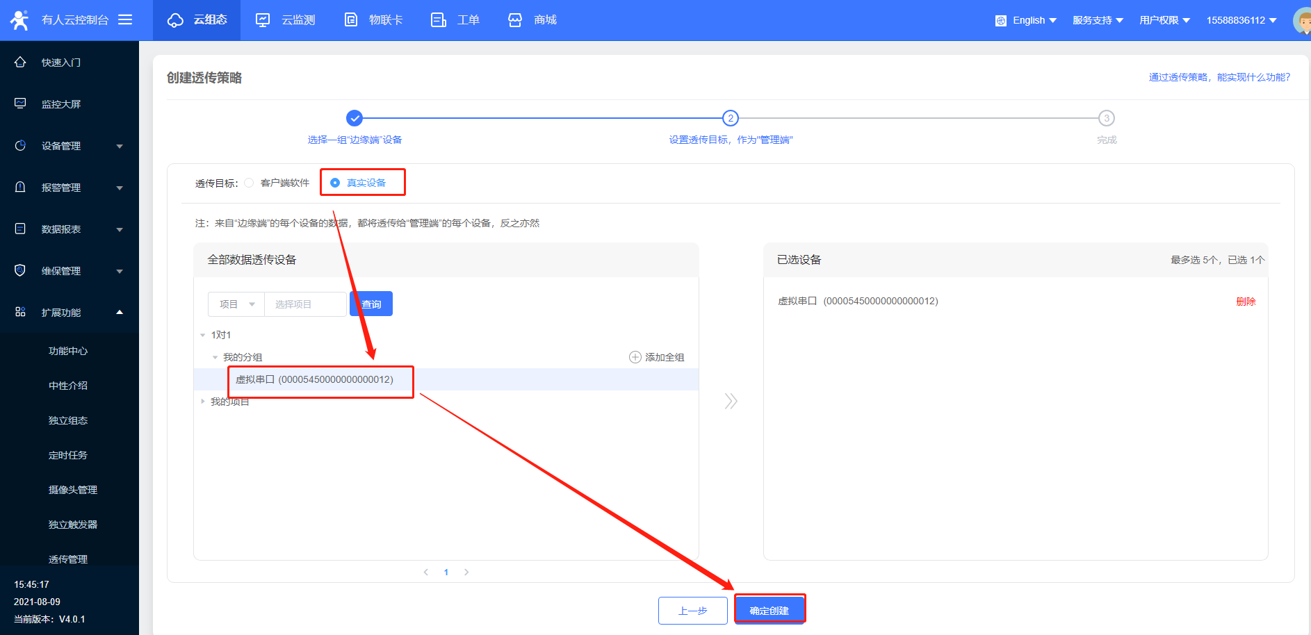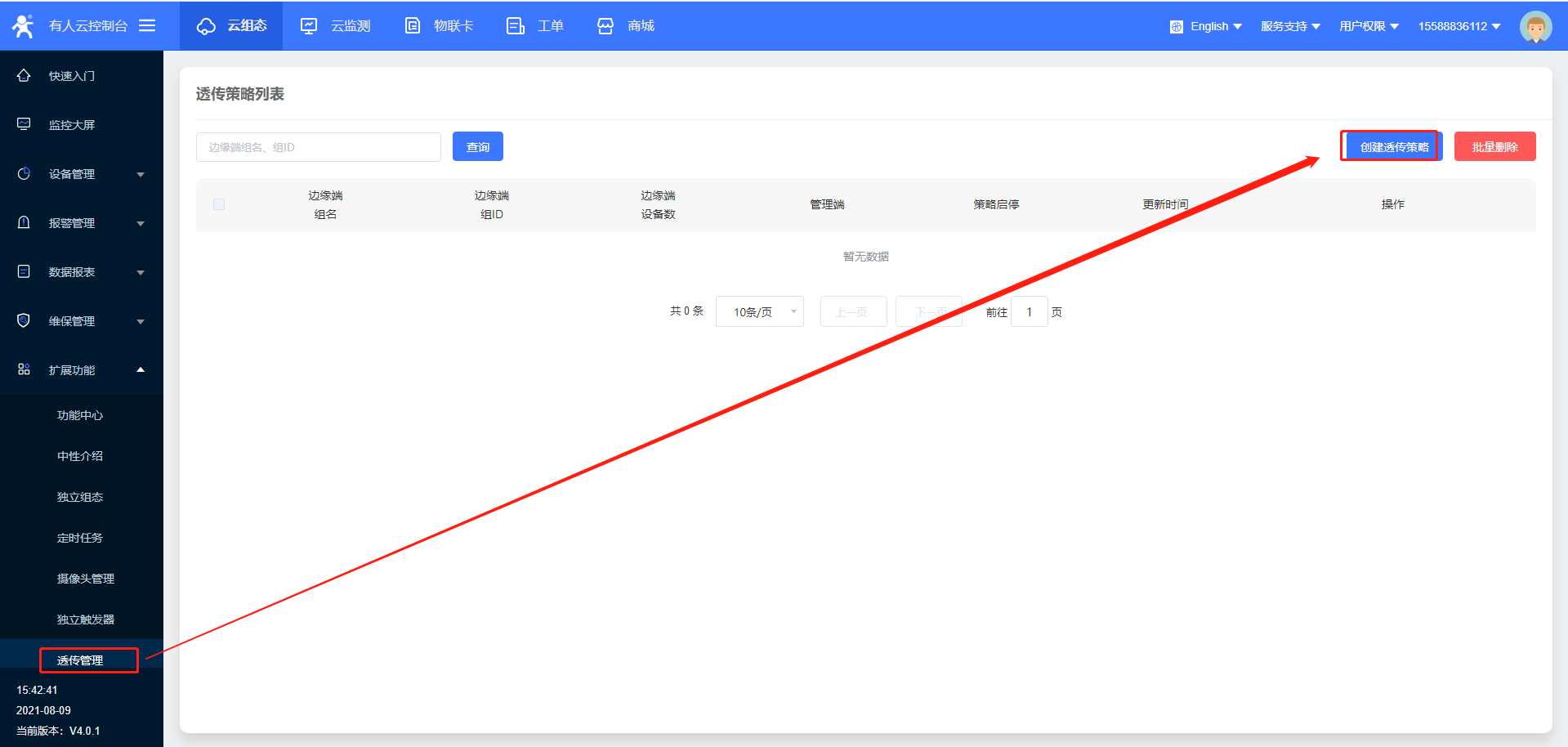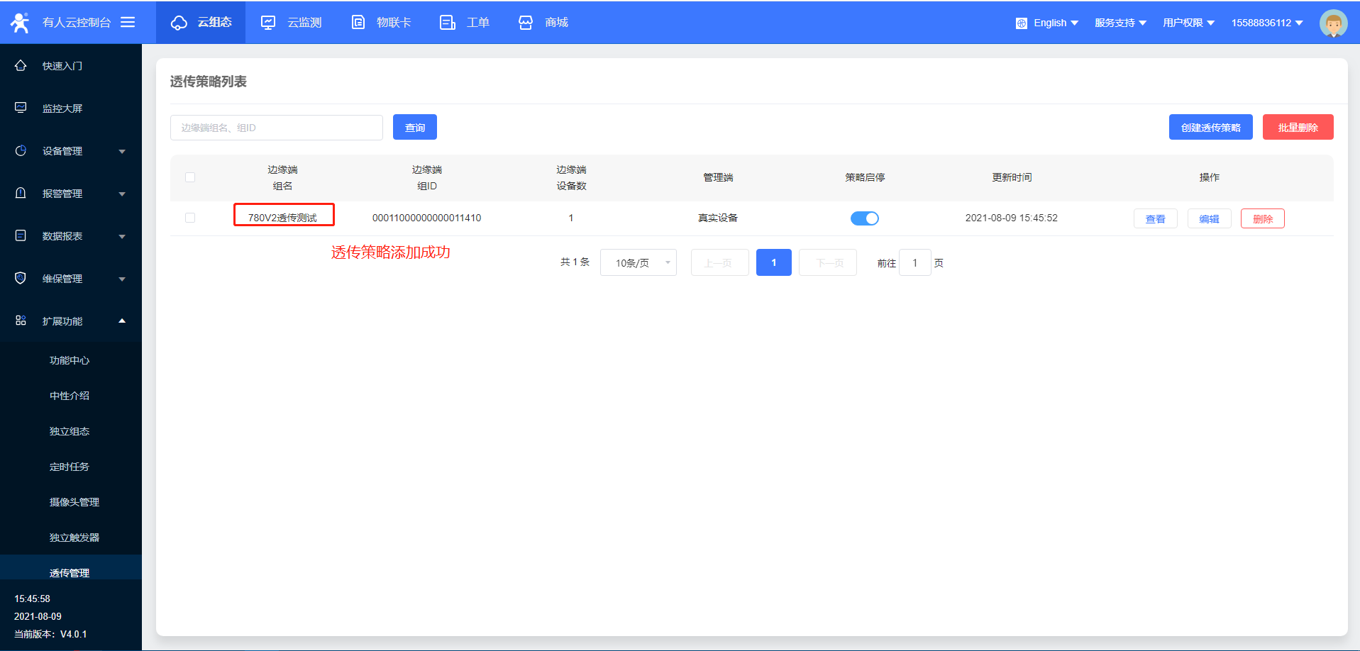 9>透傳管理策略創建成功