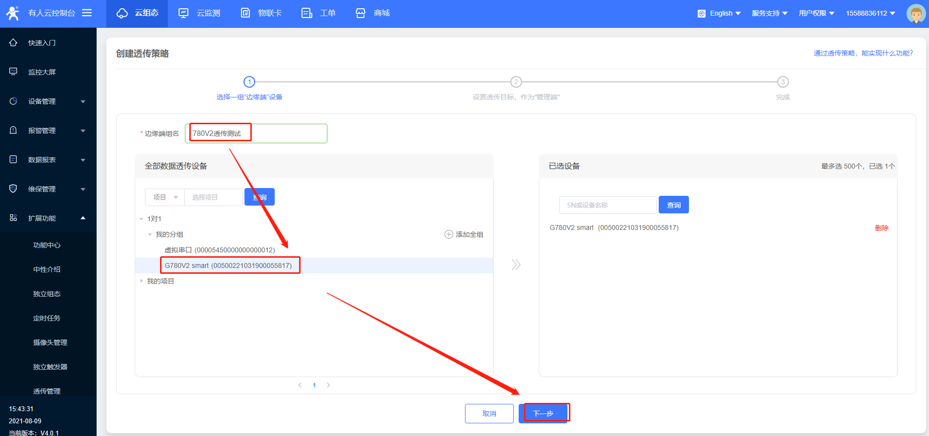 2>添加G780V2,以SN和IMEI添加,選擇數據透傳模板