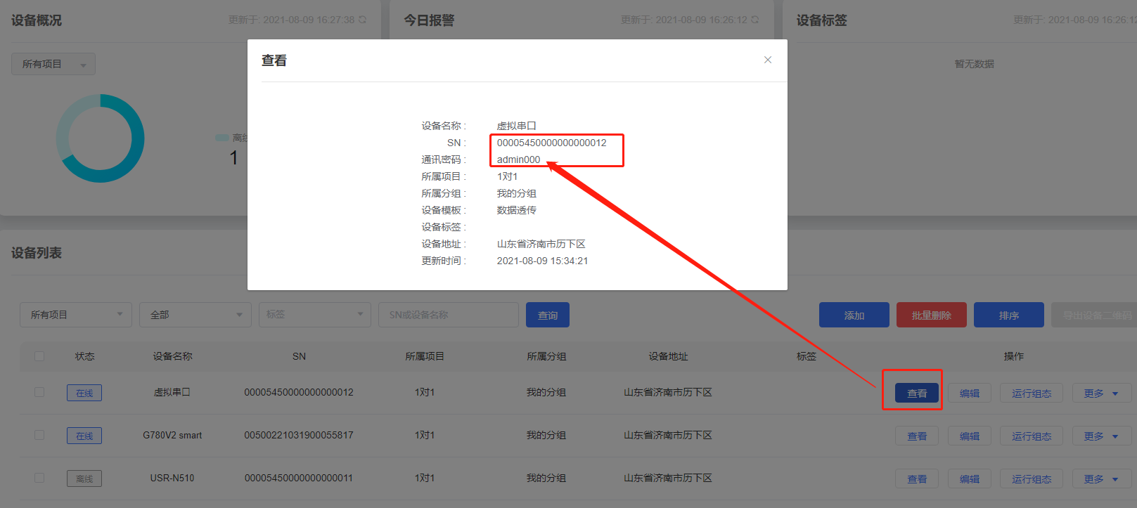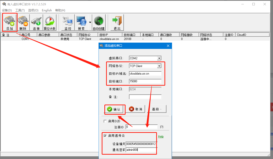 啟用透傳云:設備編號和通訊密碼見下圖,直接復制到虛擬串口軟件的編號和密碼即可
