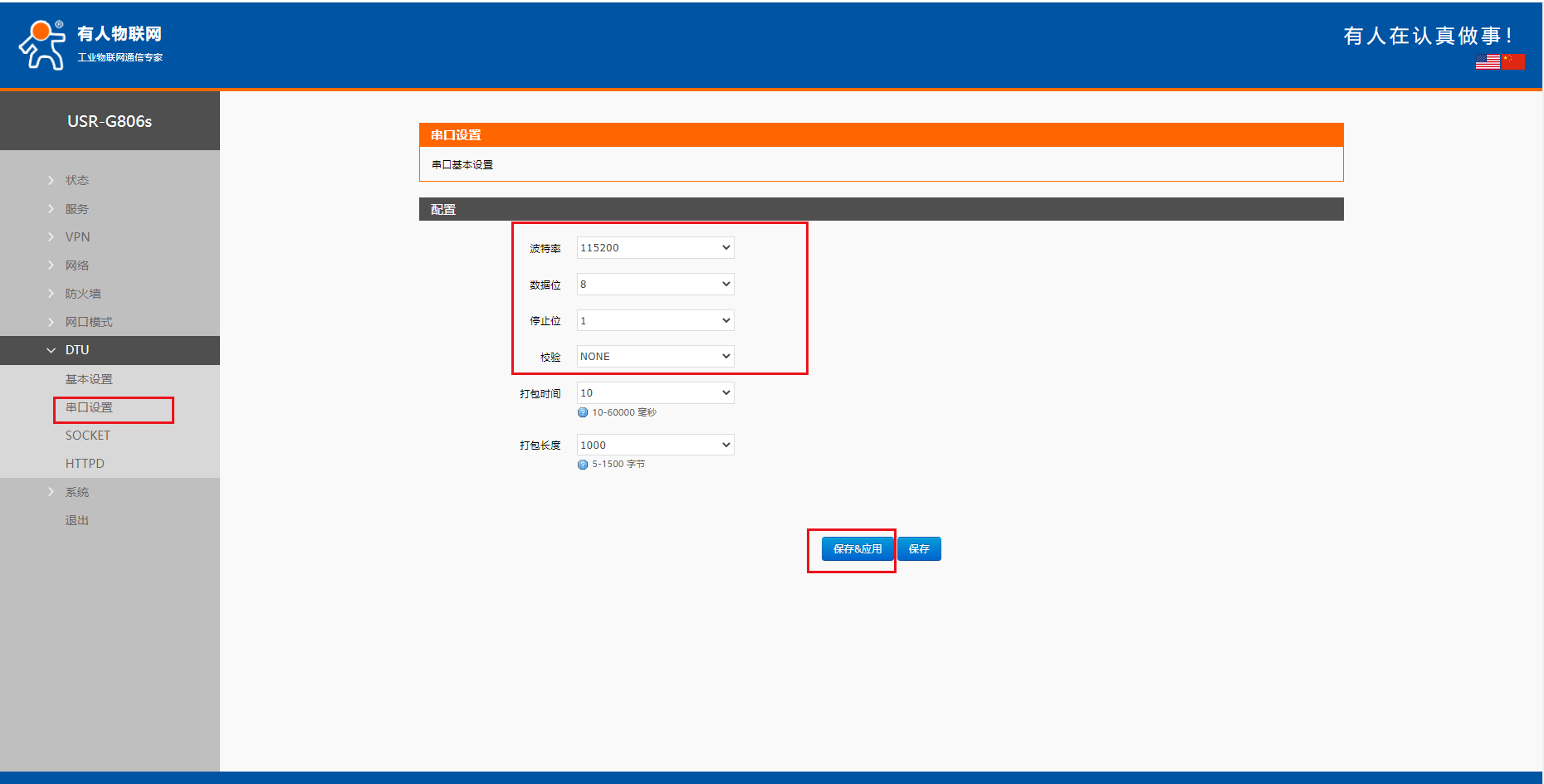 在DTU---串口設(shè)置,修改G781的串口參數(shù)和要接的485設(shè)備一致,測(cè)試默認(rèn)用出廠(chǎng)的。
