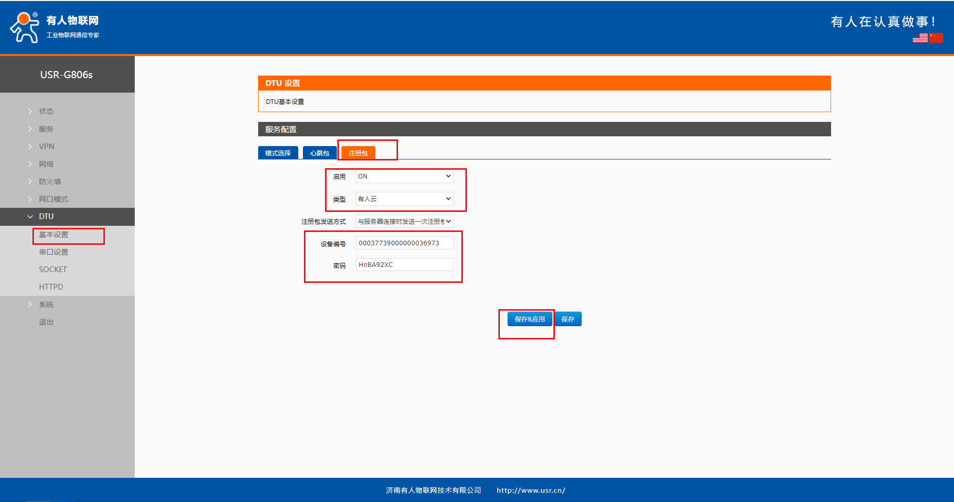 在DTU---基本設(shè)置---心注冊(cè)包,注冊(cè)包類(lèi)型選擇有人云,設(shè)備編號(hào)和密碼填寫(xiě)云端自動(dòng)分配的。