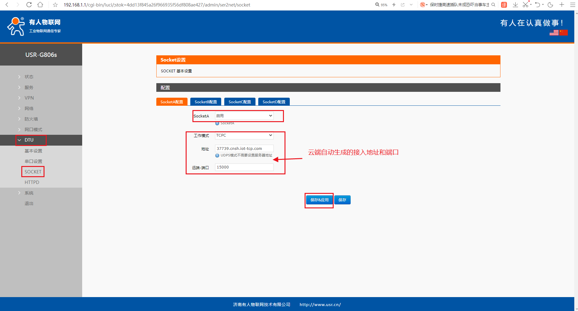 開(kāi)啟SOCKET功能,設(shè)置有人云的IP地址(云端自動(dòng)生成的接入地址)以及端口號(hào)(15000),然后點(diǎn)擊應(yīng)用
