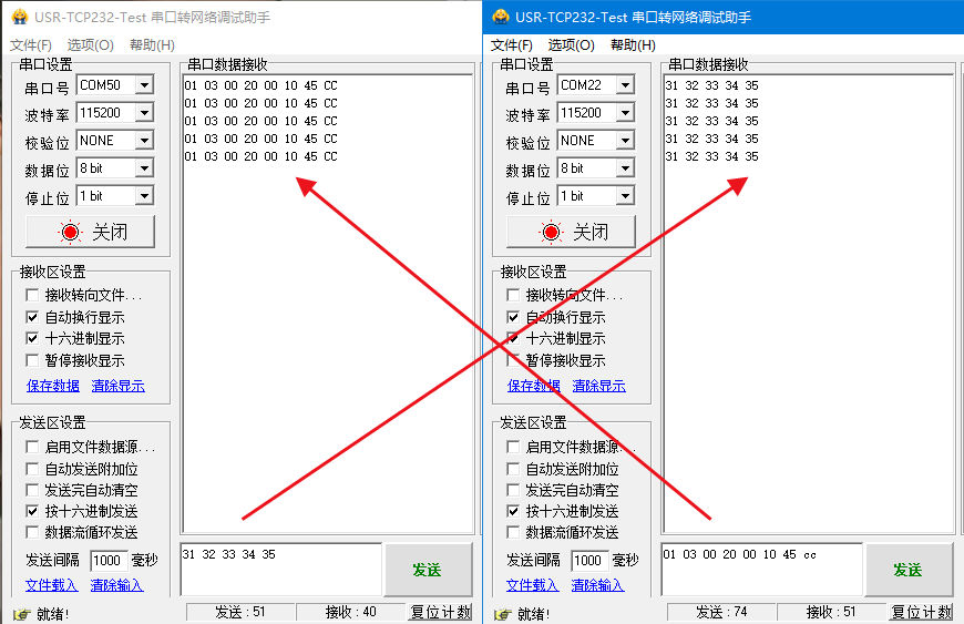 用串口調(diào)試助手分別打開(kāi)806s用485轉(zhuǎn)usb接電腦上,識(shí)別的com口和虛擬串口com22,互發(fā)數(shù)據(jù)
