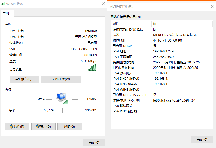 1. PC通過WIFI/有線LAN口連接G806s,電腦開啟DHCP,自動獲取IP 如下圖所示(出廠狀態下):
