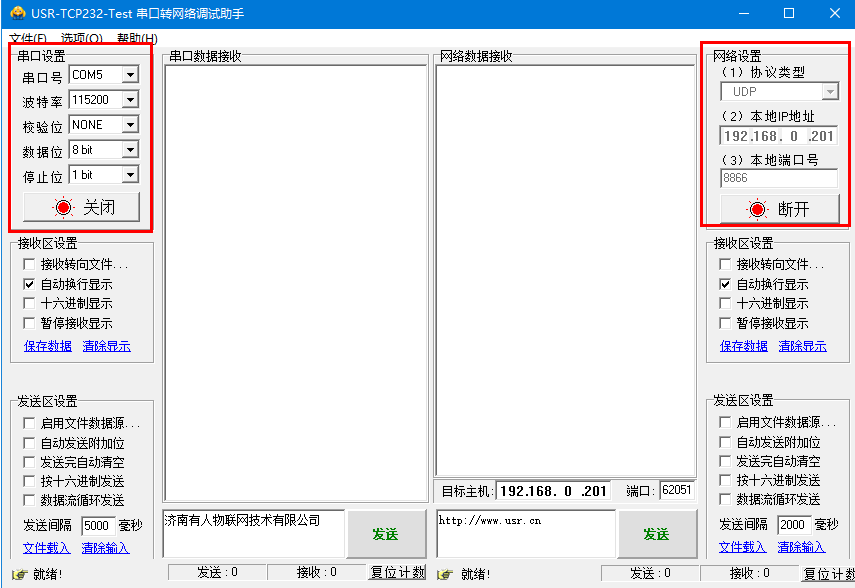 網(wǎng)絡(luò)協(xié)議配置為UDP server,本地IP地址為192.168.0.201,本地端口號(hào)自定義設(shè)置(8866),點(diǎn)擊開啟監(jiān)聽,打開真實(shí)串口COM5。