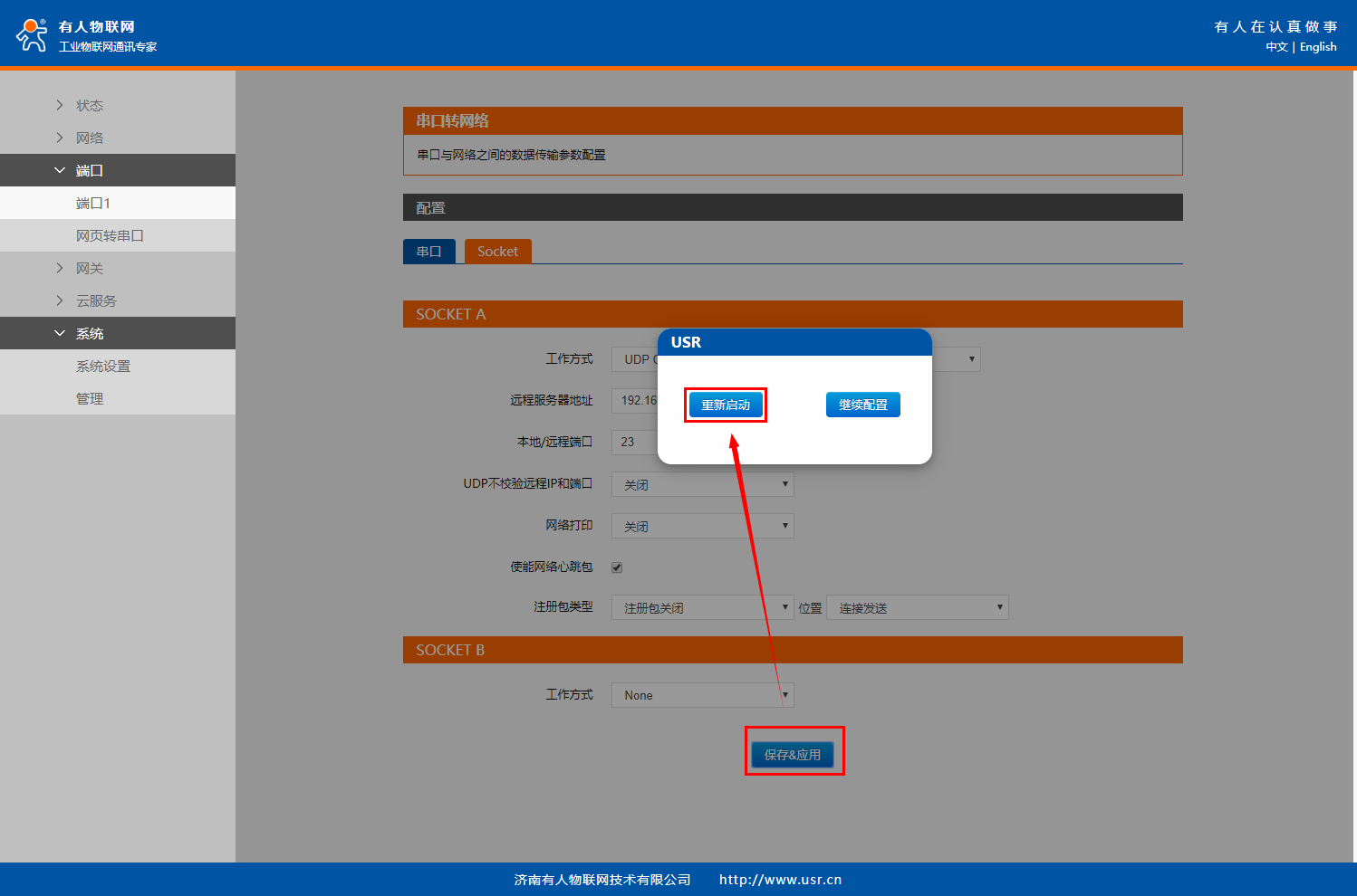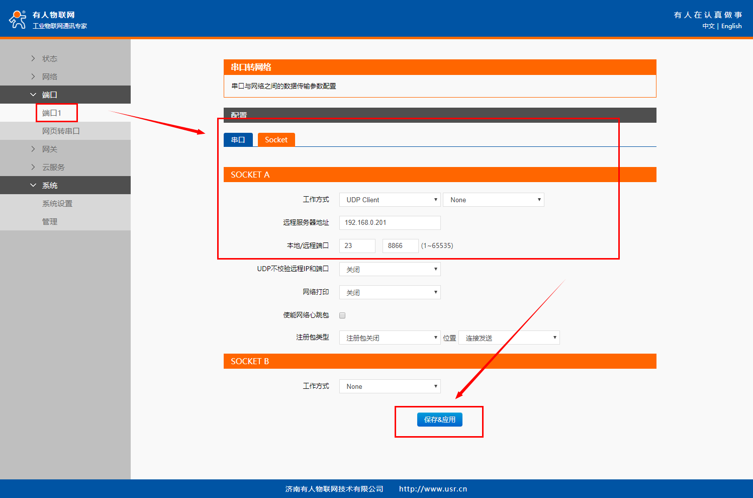 在“端口”>“端口1”界面中的“Socet”配置Socket A的工作模式為“UDP Client”