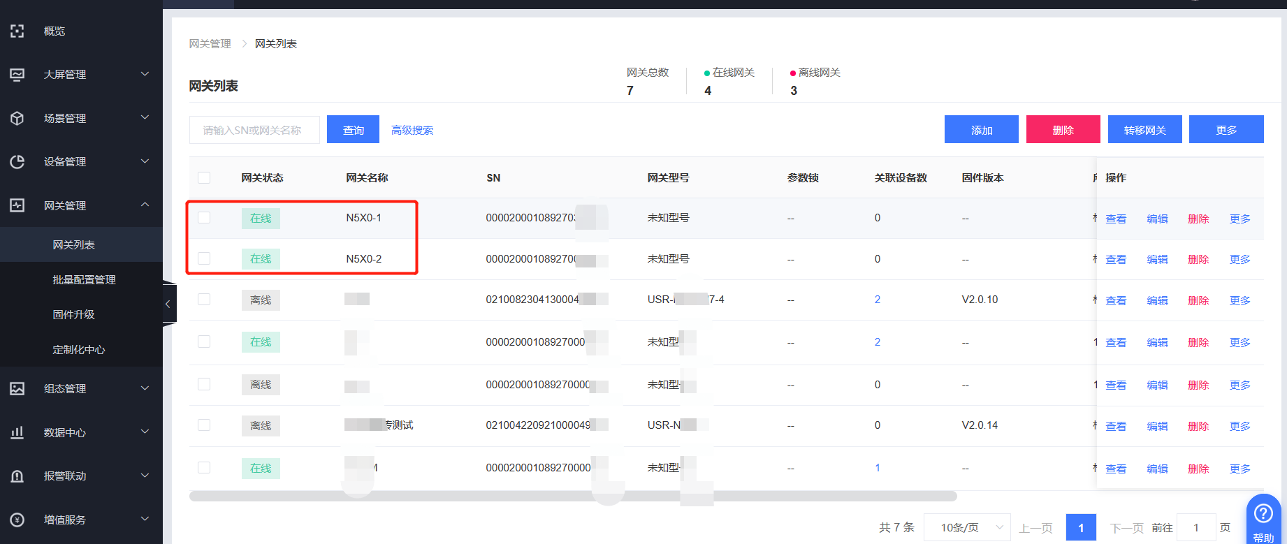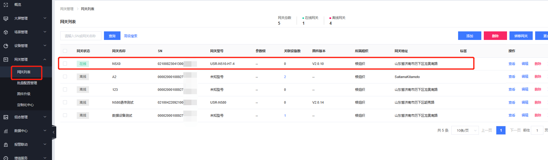 6、以同樣方式添加第二個N5X0,同樣勾選有人云透傳后保存一下,可以看到2個N5X0在云端都在線了。