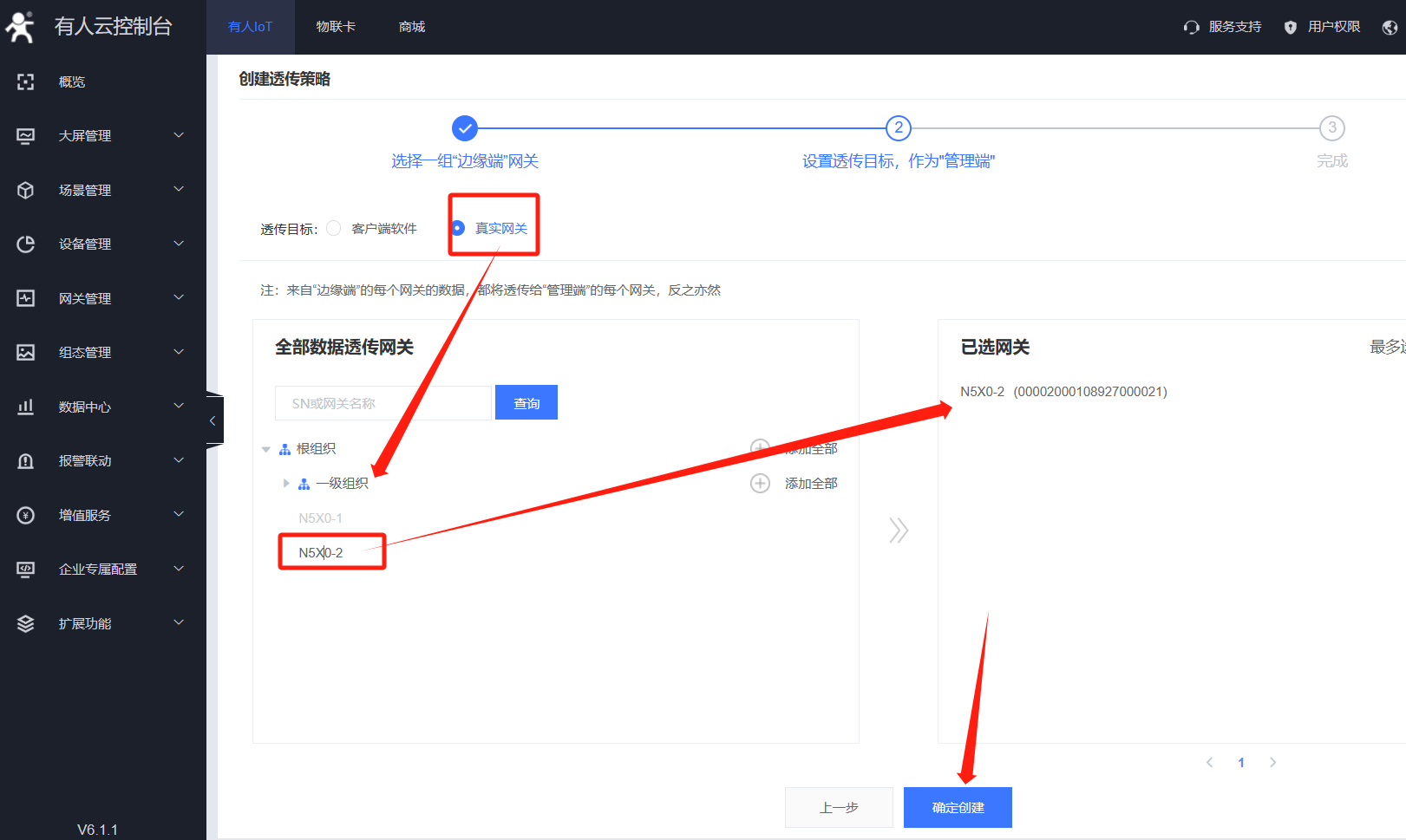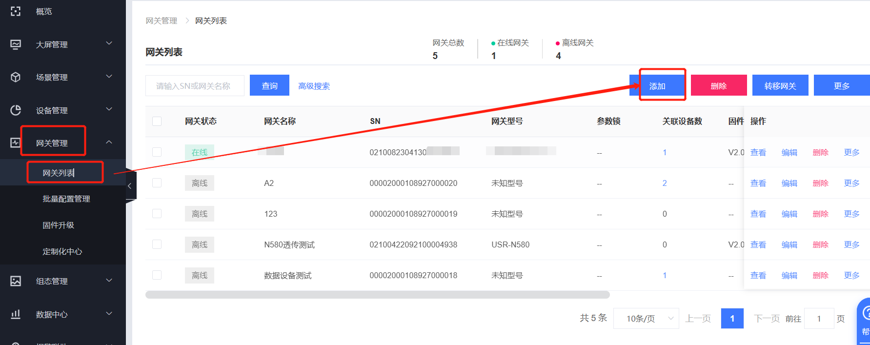 5、點擊網關管理----網關列表----添加網關,選擇網關所屬組織,輸入N5X0的SN和MAC信息,勾選有人云透傳,點擊保存。