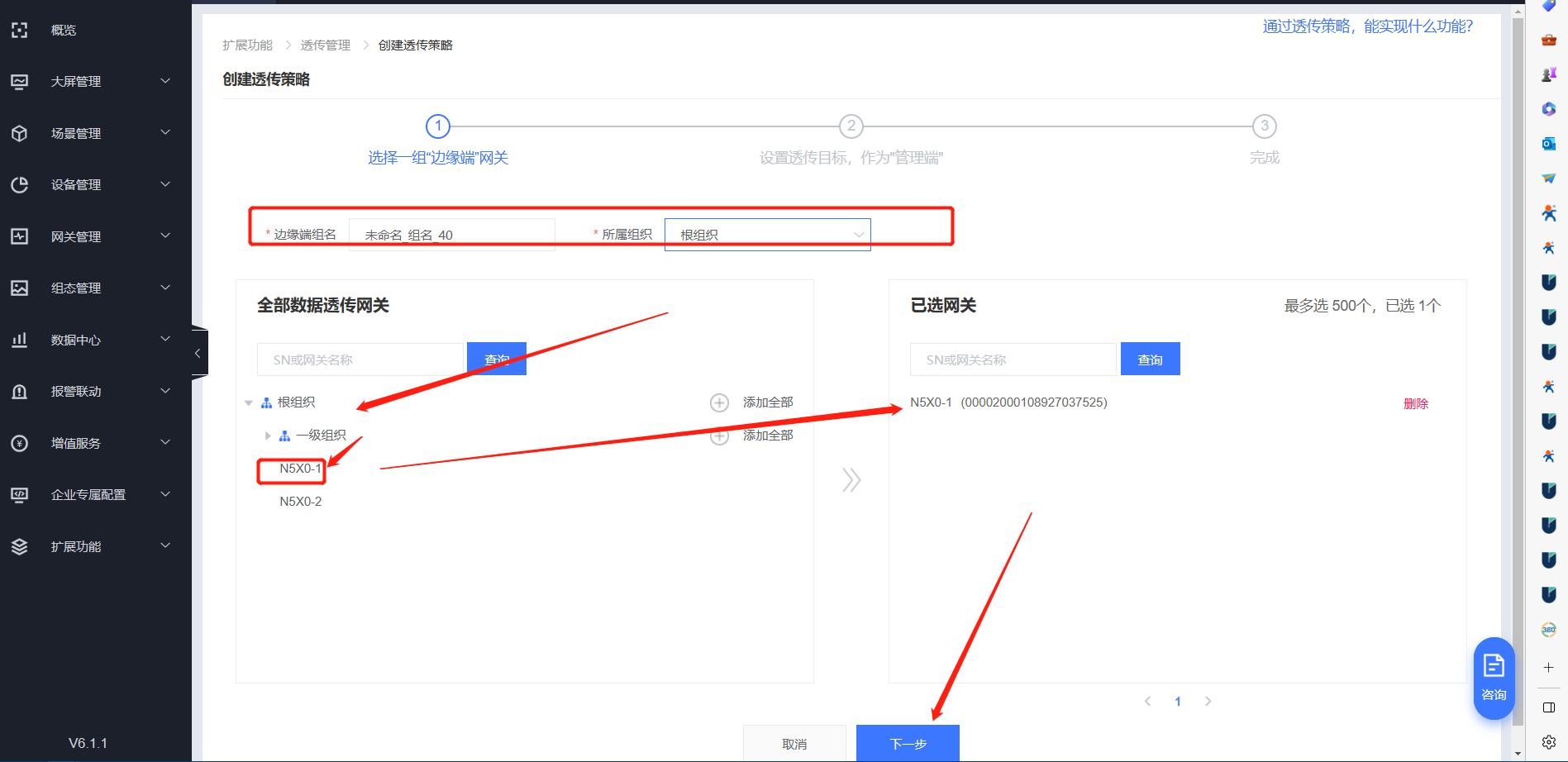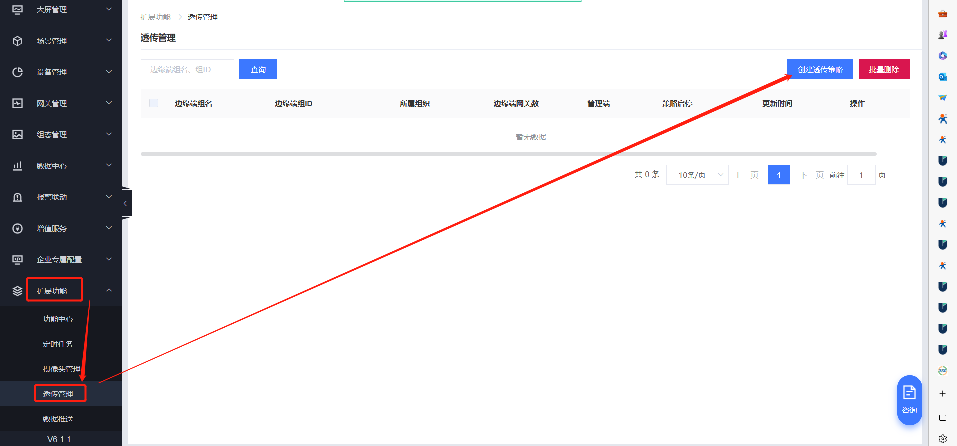 7、點擊“擴展功能”---“透傳管理”---“創建透傳策略”