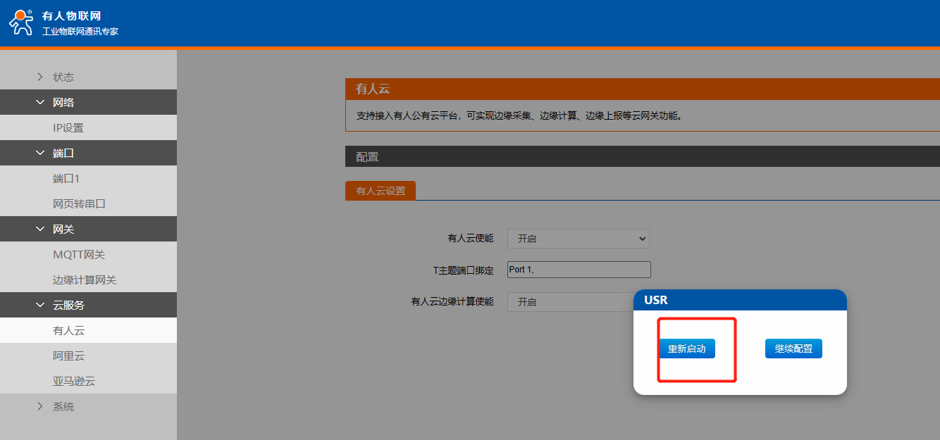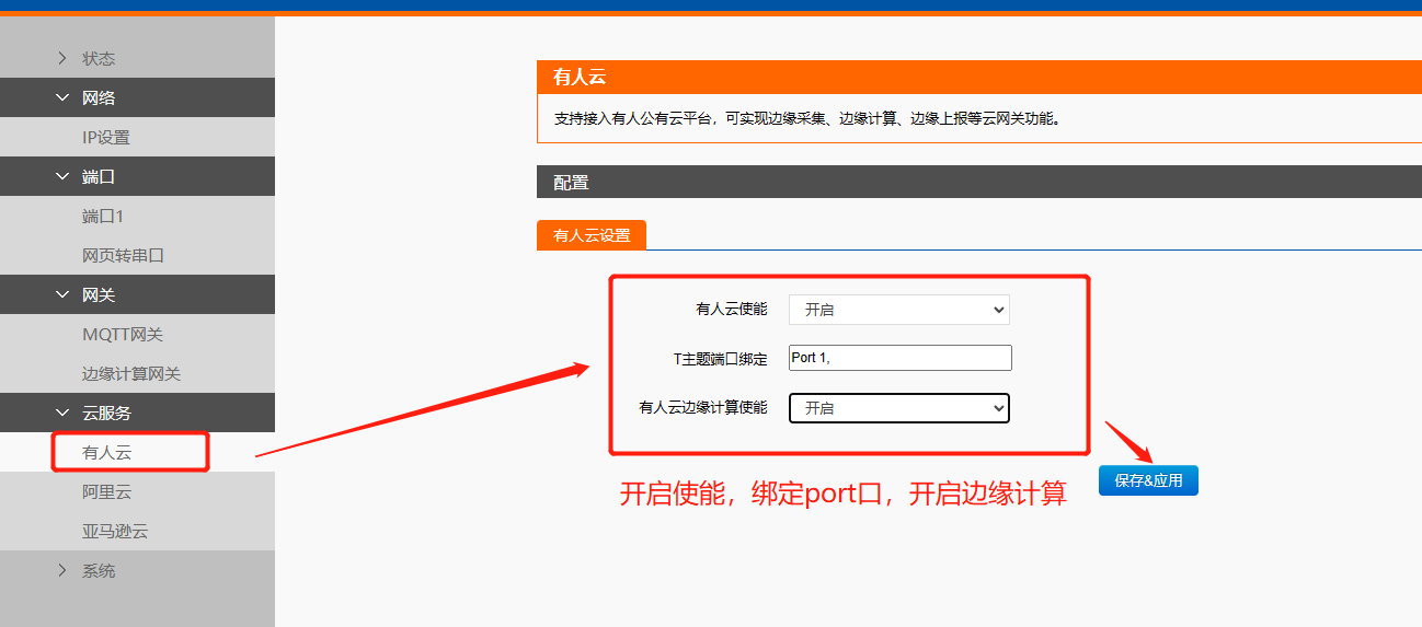 4、開啟有人云使能,并綁定port端口,開啟邊緣計算使能,保存參數,重啟N5X0。