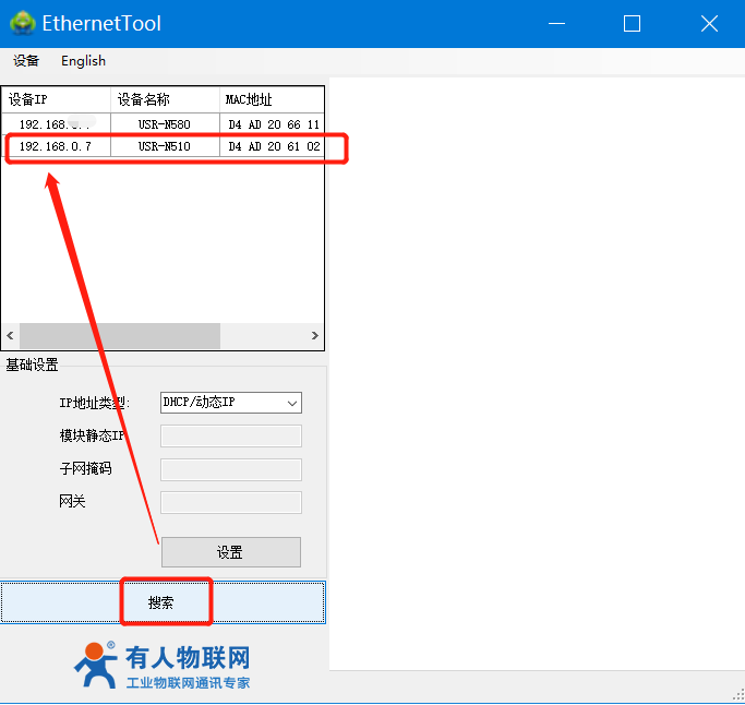 2、打開H7設置軟件,當搜索列表中出現N5X0的設備后,單擊設備,輸入用戶名和密碼都是admin,ip設置為動態獲取DHCP。