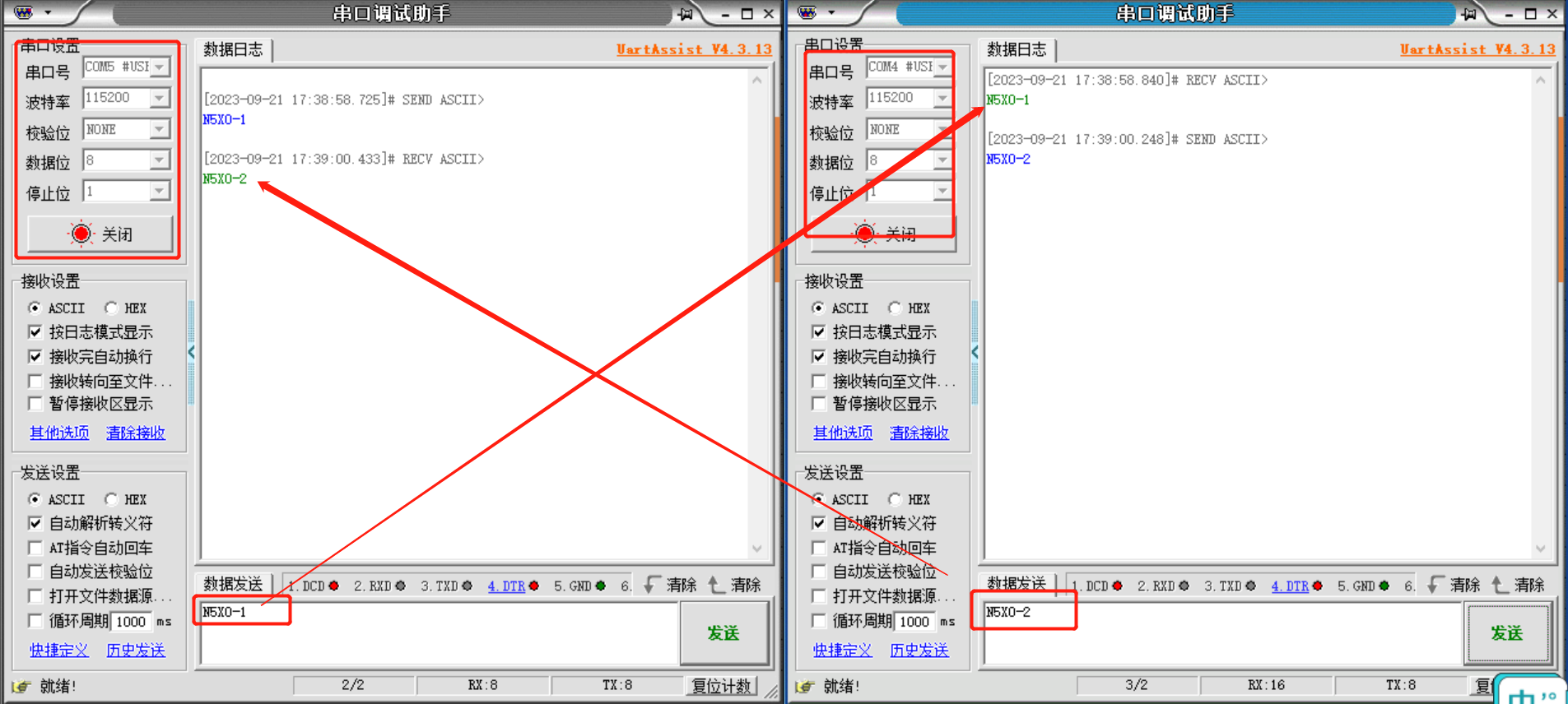 2個N5X0分別接485轉usb串口線到電腦,電腦設備管理器會生成2個com口,分別打開2個串口助手,選擇好對應的串口參數,進行數據互發測試。