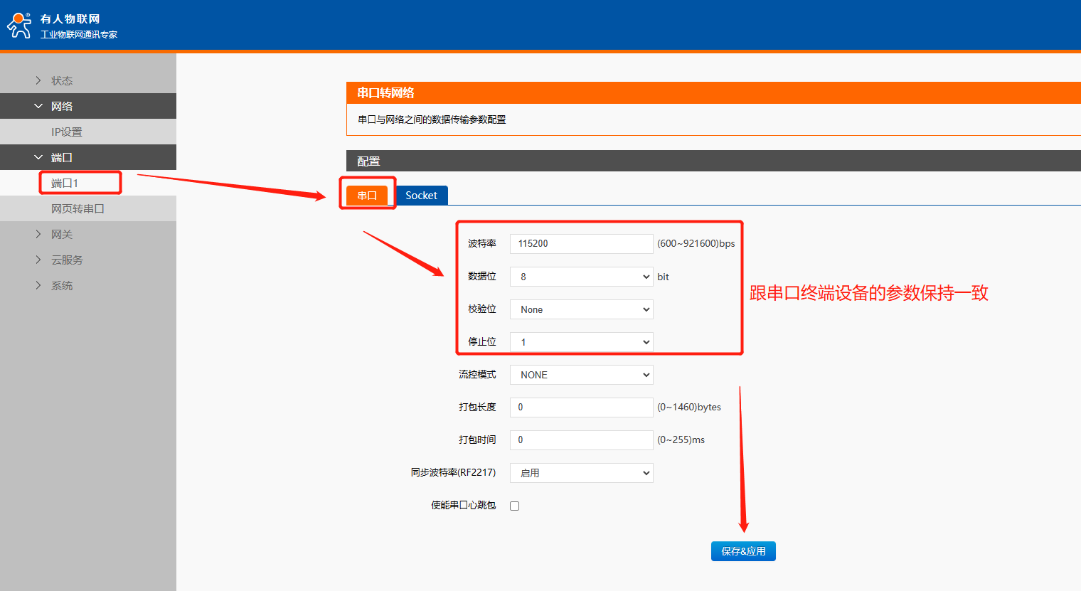 3、點擊端口1,配置串口參數跟終端設備參數保持一致。