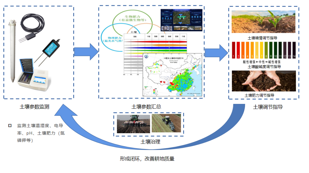 通過對土壤溫濕度、電導率、pH、肥力等數據的監(jiān)測,數據匯總,提供針對性土壤治理措施,治理過沙或過黏土壤、鹽堿土壤和酸化土壤,提高耕地質量水平。