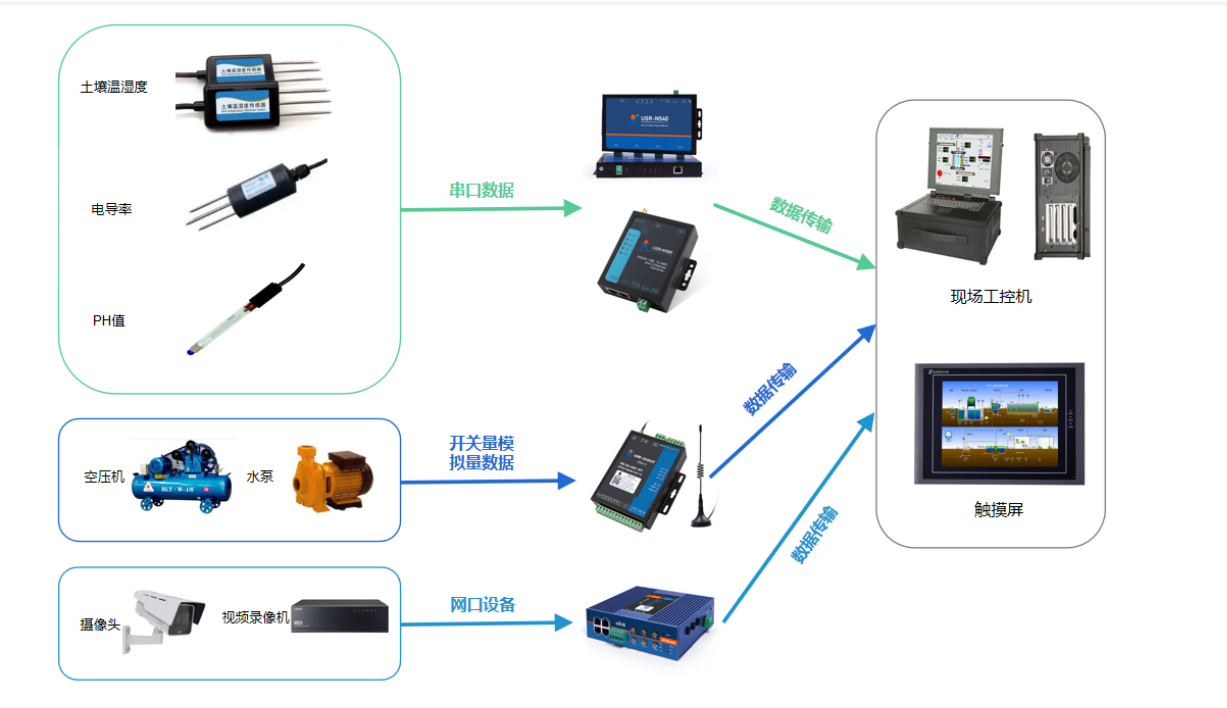 v 若現場終端設備為串口設備,可以通過串口服務器或wifi串口服務器將數據傳輸至現場本地工控機或觸摸屏顯示。此時要確認現場是否方便布線,若方便布線可選用串口服務器,若現場有wifi覆蓋可選用wifi串口服務器;