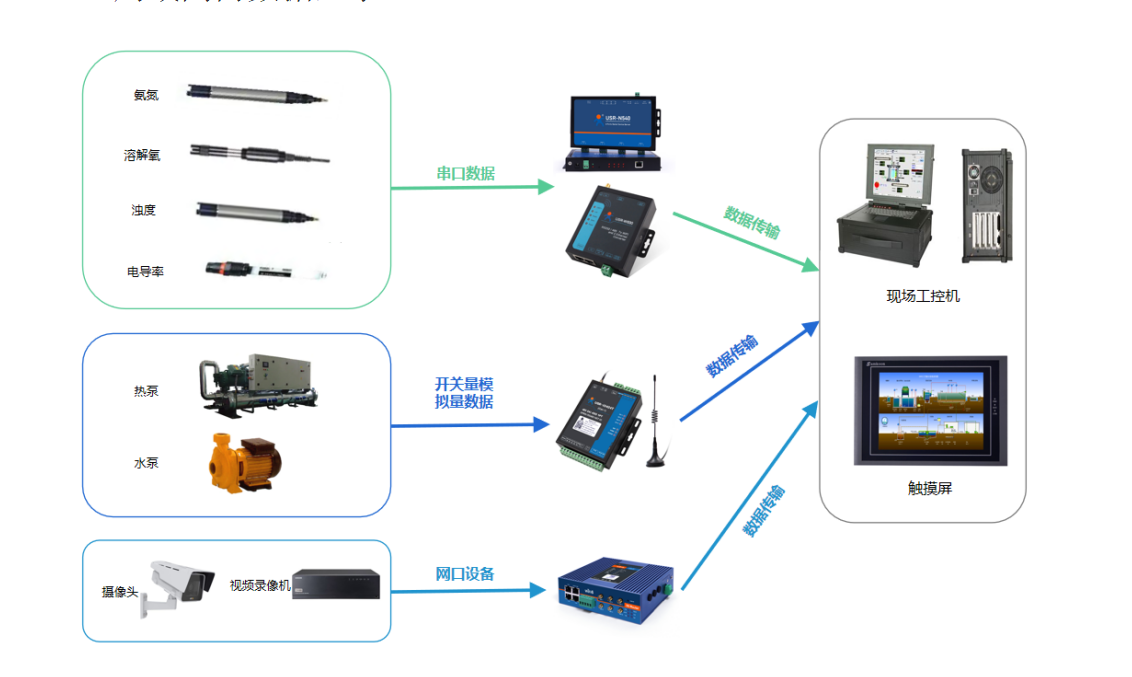 v 若現(xiàn)場(chǎng)終端設(shè)備為開(kāi)關(guān)量或模擬量設(shè)備,可以通過(guò)網(wǎng)絡(luò)IO設(shè)備將數(shù)據(jù)傳輸至現(xiàn)場(chǎng)本地工控機(jī)或觸摸屏顯示。若現(xiàn)場(chǎng)方便布線或有wifi覆蓋可選用網(wǎng)絡(luò)IO中EWR版本;
