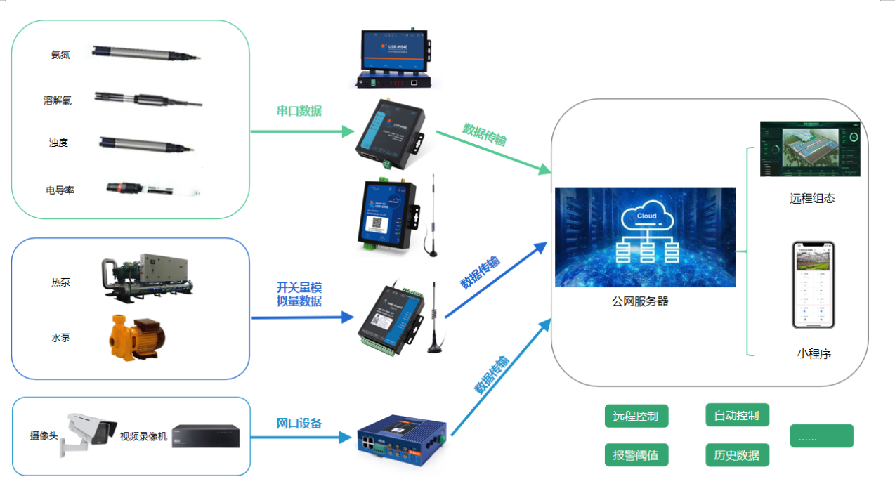 v 若現(xiàn)場(chǎng)終端設(shè)備為串口設(shè)備,可以通過(guò)串口服務(wù)器、wifi串口服務(wù)器或DTU將數(shù)據(jù)傳輸至遠(yuǎn)程服務(wù)器顯示。若現(xiàn)場(chǎng)有4G信號(hào)時(shí)可選用DTU進(jìn)行數(shù)據(jù)傳輸;若方便布線可選用串口服務(wù)器;若現(xiàn)場(chǎng)有wifi覆蓋可選用wifi串口服務(wù)器;