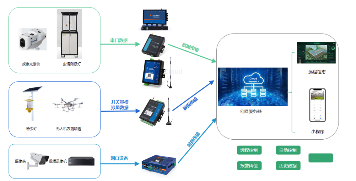 v 若現(xiàn)場(chǎng)終端設(shè)備為串口設(shè)備,可以通過串口服務(wù)器、wifi串口服務(wù)器或DTU將數(shù)據(jù)傳輸至遠(yuǎn)程服務(wù)器顯示。若現(xiàn)場(chǎng)有4G信號(hào)時(shí)可選用DTU進(jìn)行數(shù)據(jù)傳輸;若方便布線可選用串口服務(wù)器;若現(xiàn)場(chǎng)有wifi覆蓋可選用wifi串口服務(wù)器;
