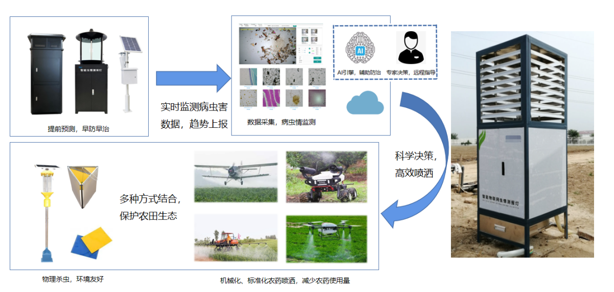 通過蟲情測(cè)報(bào)燈、智能孢子捕捉儀等智能儀器實(shí)時(shí)監(jiān)測(cè)病蟲害情況,實(shí)時(shí)上報(bào)高清圖片,平臺(tái)通過AI圖像識(shí)別進(jìn)行實(shí)時(shí)判斷,預(yù)測(cè)病蟲害發(fā)生情況,及時(shí)提醒,科學(xué)指導(dǎo)農(nóng)藥配撒,減少損失;