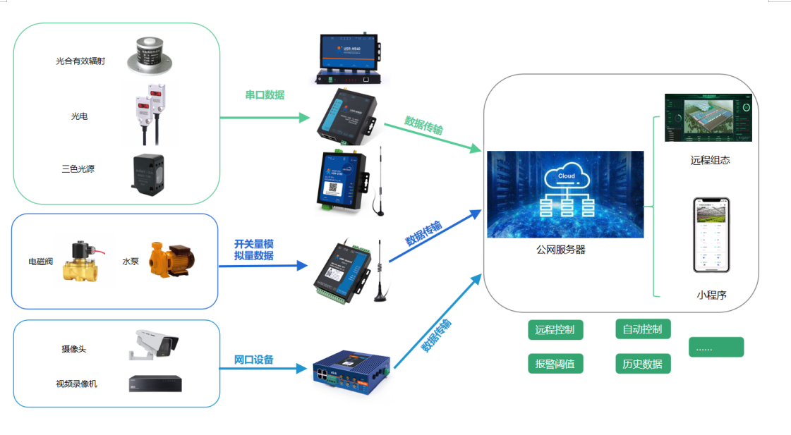 v 若現(xiàn)場(chǎng)終端設(shè)備為開(kāi)關(guān)量或模擬量設(shè)備,可以通過(guò)網(wǎng)絡(luò)IO設(shè)備將數(shù)據(jù)傳輸至公網(wǎng)服務(wù)器。若現(xiàn)場(chǎng)有4G信號(hào)可選用網(wǎng)絡(luò)IO中CAT1或G5版本;若現(xiàn)場(chǎng)方便布線或有wifi覆蓋可選用EWR版本;