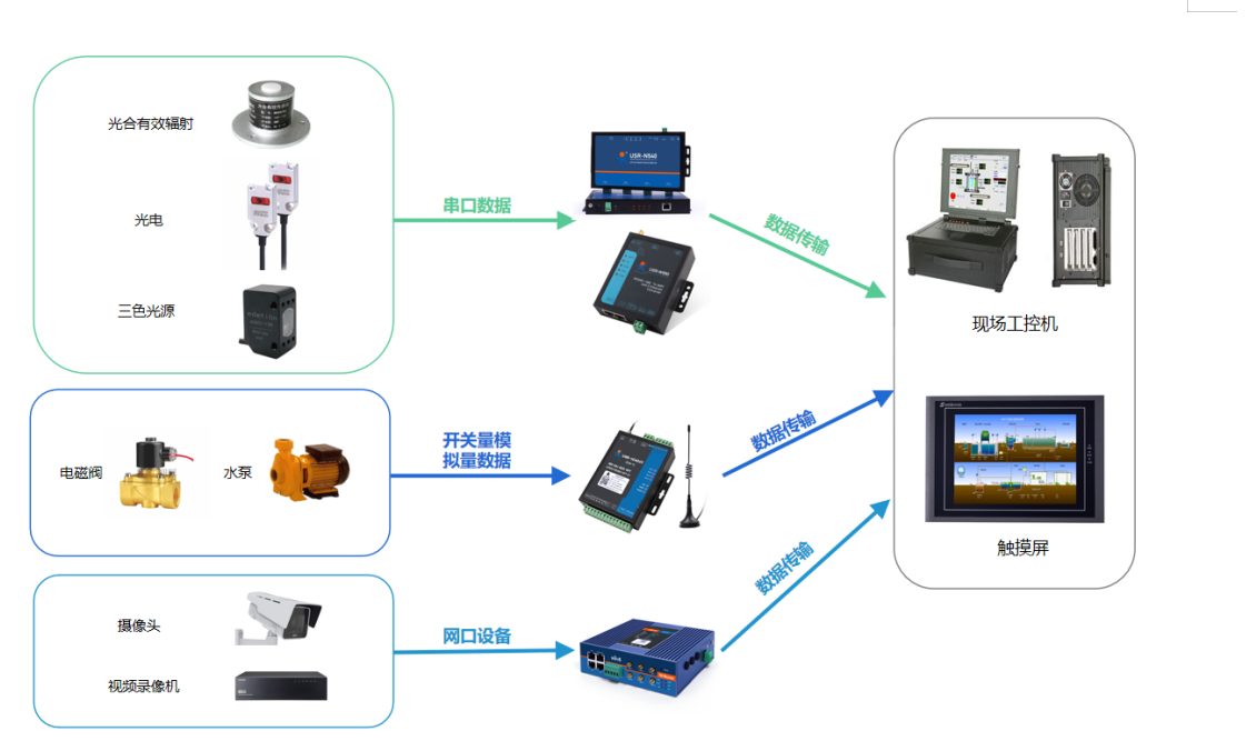 v 若現(xiàn)場(chǎng)終端設(shè)備為開(kāi)關(guān)量或模擬量設(shè)備,可以通過(guò)網(wǎng)絡(luò)IO設(shè)備將數(shù)據(jù)傳輸至現(xiàn)場(chǎng)本地工控機(jī)或觸摸屏顯示。若現(xiàn)場(chǎng)方便布線或有wifi覆蓋可選用網(wǎng)絡(luò)IO中EWR版本;