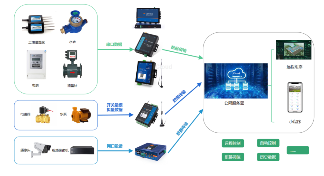 v 若現(xiàn)場終端設(shè)備為串口設(shè)備,可以通過串口服務(wù)器、wifi串口服務(wù)器或DTU將數(shù)據(jù)傳輸至遠(yuǎn)程服務(wù)器顯示。若現(xiàn)場有4G信號時可選用DTU進(jìn)行數(shù)據(jù)傳輸;若方便布線可選用串口服務(wù)器;若現(xiàn)場有wifi覆蓋可選用wifi串口服務(wù)器;