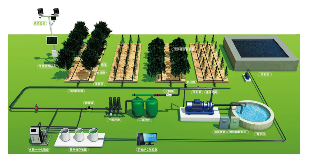 水肥一體機系統(tǒng)主要由給水系統(tǒng)、施肥機、監(jiān)控系統(tǒng)、回水池、補水系統(tǒng)和殺菌消毒裝置等組成