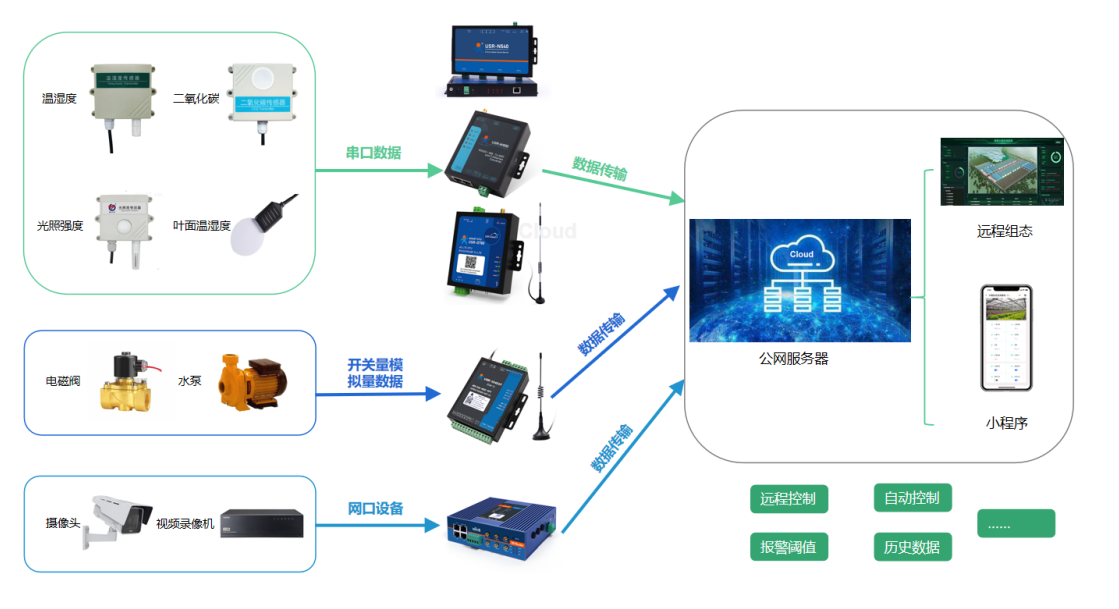 v 若現(xiàn)場(chǎng)終端設(shè)備為開(kāi)關(guān)量或模擬量設(shè)備,可以通過(guò)網(wǎng)絡(luò)IO設(shè)備將數(shù)據(jù)傳輸至公網(wǎng)服務(wù)器。若現(xiàn)場(chǎng)有4G信號(hào)可選用網(wǎng)絡(luò)IO中CAT1或G5版本;若現(xiàn)場(chǎng)方便布線或有wifi覆蓋可選用EWR版本;