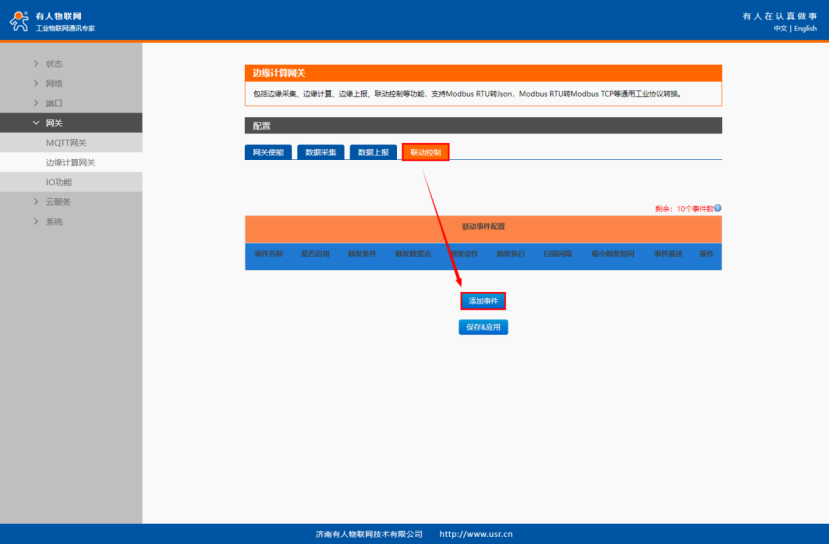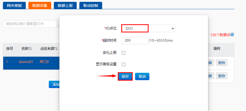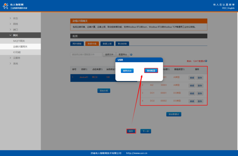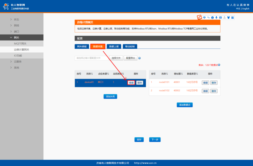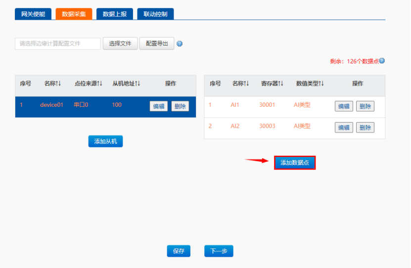 在“網關”-“邊緣計算”界面中開啟網關使能,點擊“下一步”在“數據采集界面”配置IO的數據點。