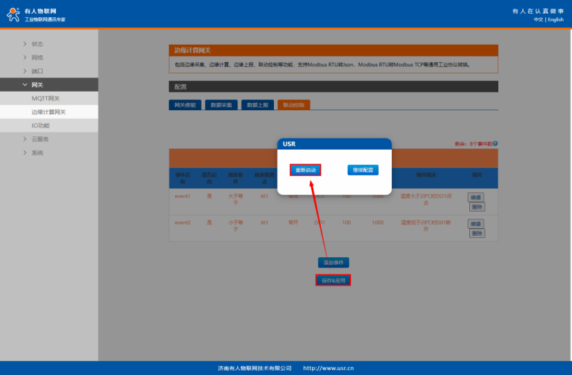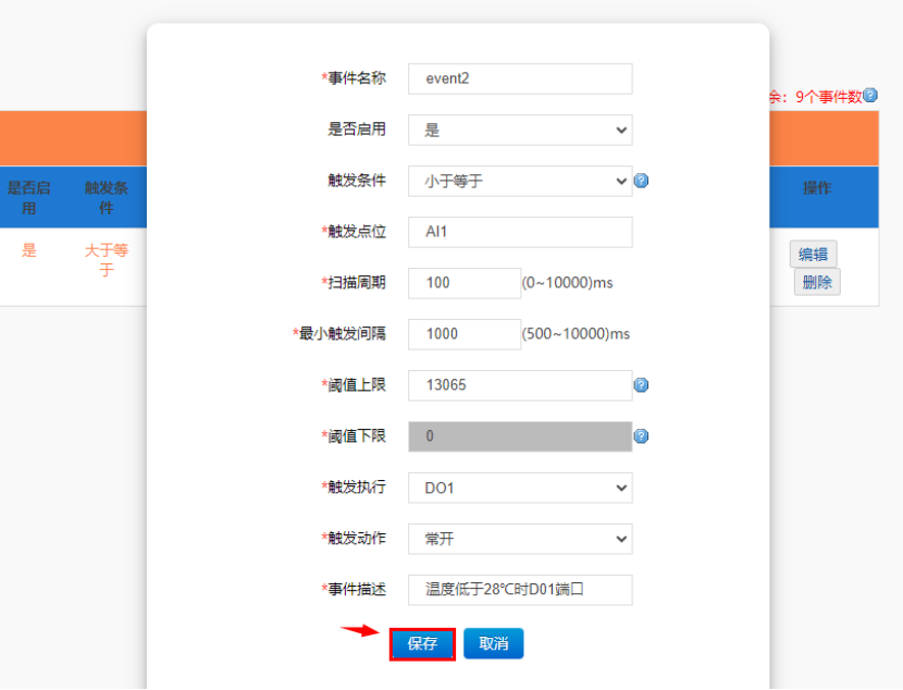 11、再次添加一個溫度低于28℃時D01斷開的事件,保存應用,重新啟動。