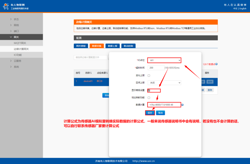 此處M100的AI1口實際接溫度模擬量。可手動添加或者自帶寄存器進行編輯,IO點位選擇“AI1”。傳感器的溫度模擬量與溫度實際值需要公式轉換,可以自行根據傳感器說明書或者咨詢傳感器廠家確定計算公式(若用戶不需要實際值上報服務器的話,可以不添加數據計算公式)。