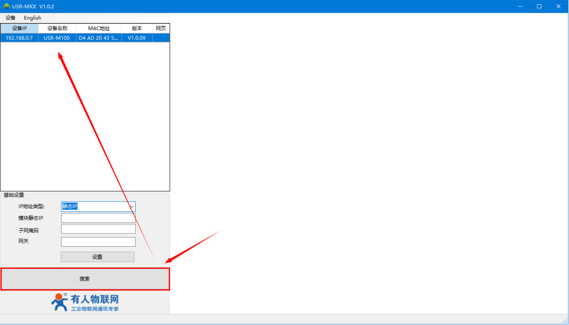 用配置軟件搜索M100設備,單擊搜索,搜搜到設備后雙擊設備。