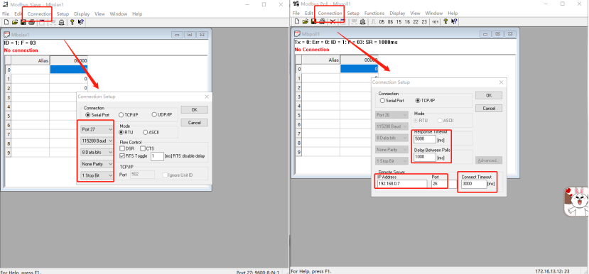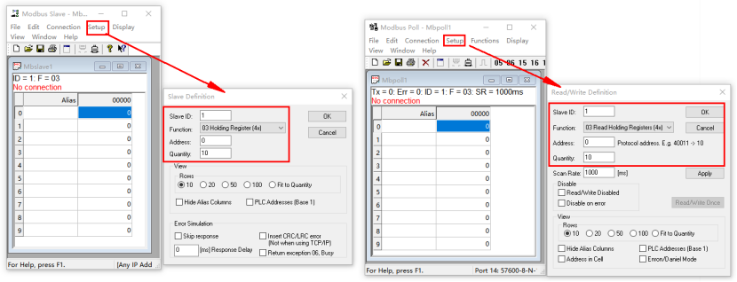 2、MODBUS SLAVE和MODBUS POLL軟件設置: