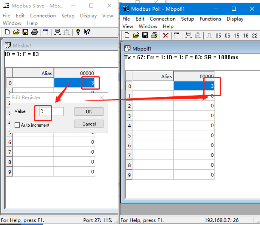 改變每個MODBUS SLAVE軟件的數據,對應的MODBUS POLL軟件就可以采集到正確的數據。