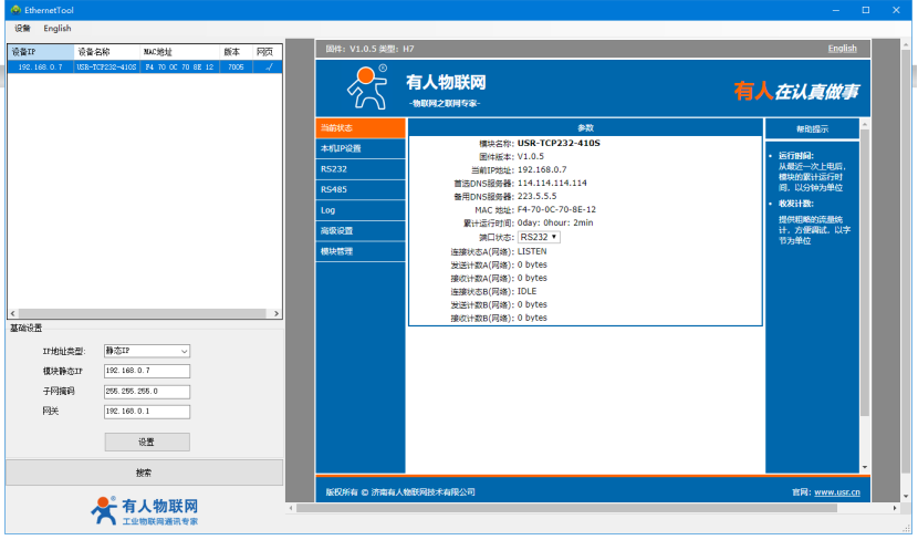 顯示IP 192.168.0.7之后,單擊IP,右側顯示410s參數設置頁面。